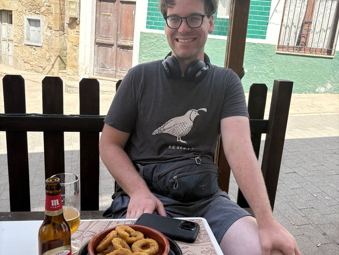 We seemed to find our individual hiking rhythms today. Of course, Perry’s was faster. It was such a treat to have gained enough confidence to hike separately. I walked in to town to see my son sitting at a tiny cafe with a beer and a plate of calamari watching for my arrival. The first half of the day we did hike together enjoying the company of Al from Arizona and Scarlett, Anthony and Joel from Alabama. I need to check out Joel’s daughter’s restaurant, Da Nada, in Birmingh